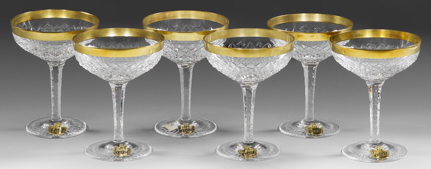Satz von sechs Champagnerschalen Farbloses Kristallglas, geschliffen. Flacher Scheibenfuß, im Boden eine umlaufende Lanzettbordüre, facettierter Stiel, die weite Schalenkuppa unterhalb mit flächigem Steinelschliff. Vergoldeter Lippenrand. Jeweils wappenförmiges, goldfarbenes Etikett mit Krone und Bez. "KARAT ECHT BLEIKRISTALL HANDGESCHLIFFEN". H. 12,7 cm.