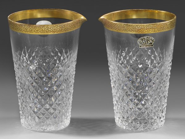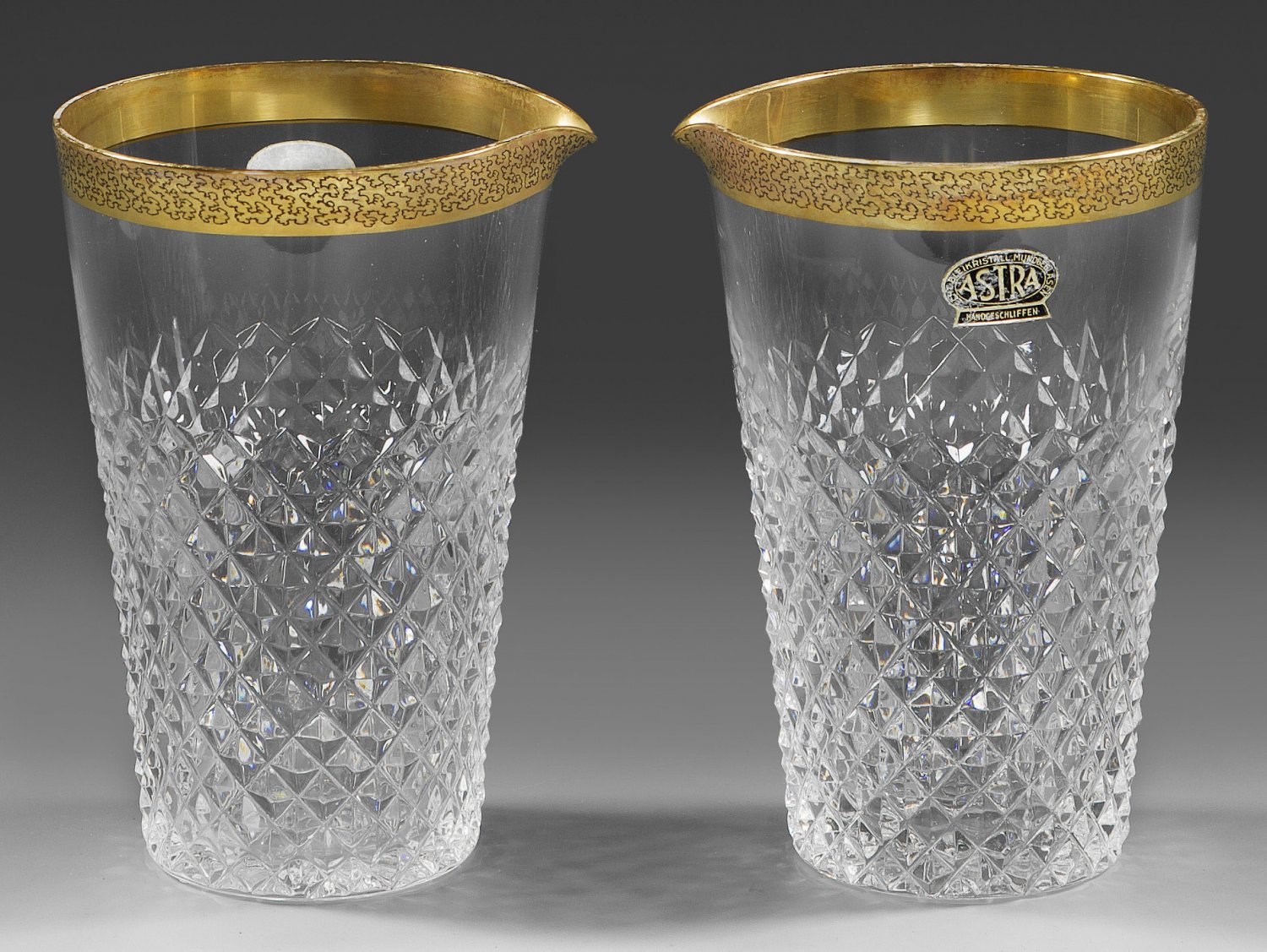 Zwei Schenkkannen Farbloses Kristallglas, geschliffen. Konische Form mit kurzer, ausgezogener Schnaupe. Untere Wandungszone mit flächigem Steinelschliff, der vergoldete Lippenrand mit Vermicelli-Fries. Firmenetikett mit Bez. "ASTRA (/) ECHT BLEIKRISTALL MUNDGEBLASEN (/) HANDGESCHLIFFEN". H. 16 cm.