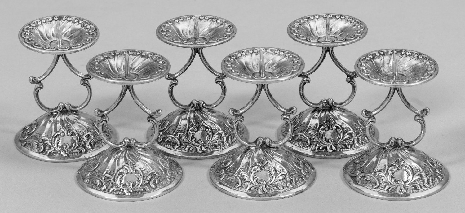 Sechs kleine Historismusleuchter Silber. Glockenförmig gewölbter Stand übergehend in einen filigranen Schaft aus schmalen plastisch gestalteten Voluten. Darüber eine gemuldete Traufschale mit Dorn. Geschweifter Rocaillendekor mit wellenförmigen Zügen. Gest. 835 Herstellerzeichen. Gew. zus. ca. 344. H. 8 cm.
