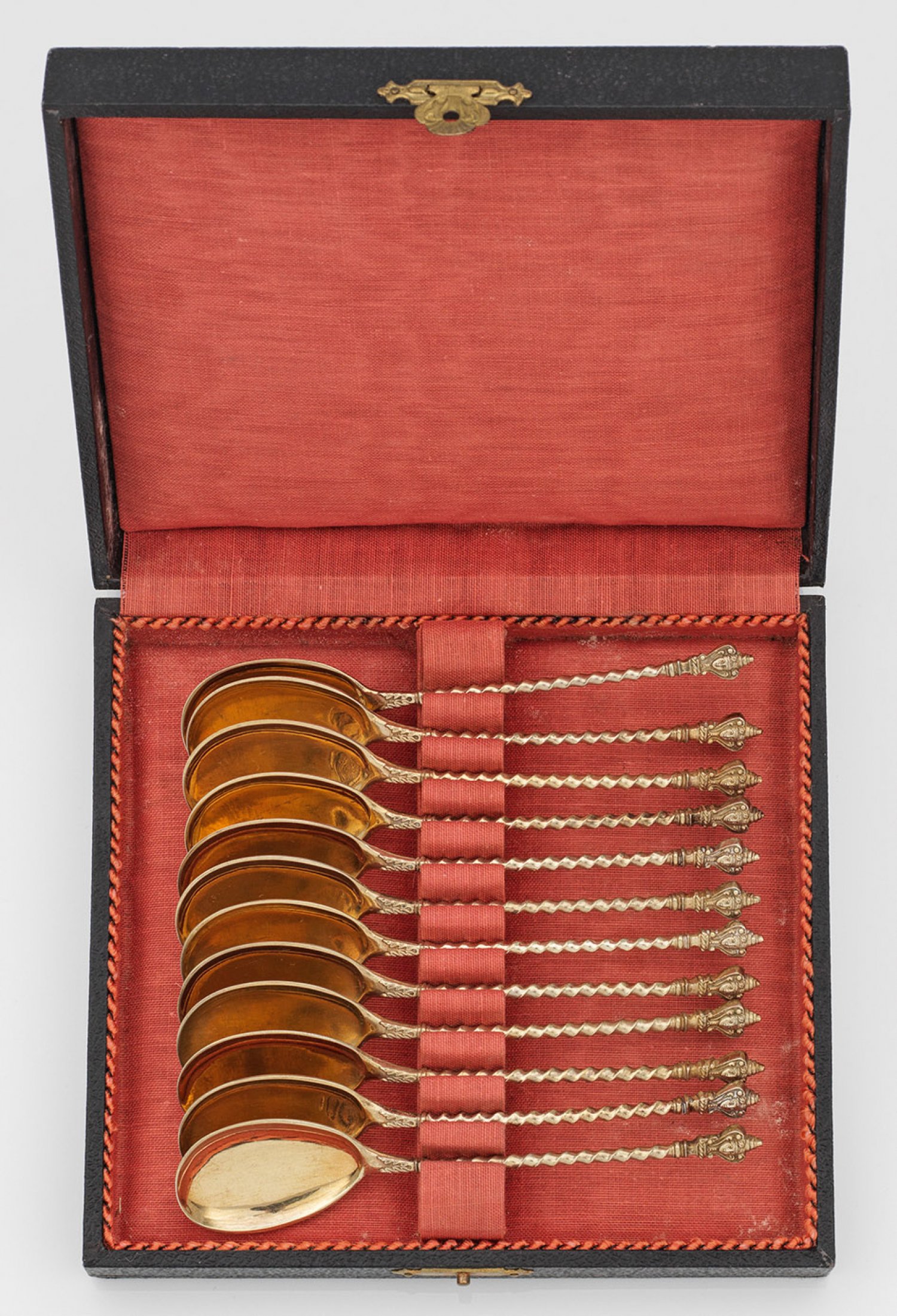Zwölf Neorenaissance-Eislöffel Silber, vergoldet. 12-tlg.; Vom reliefplastischen Ansatz in Form eines Kopfes übergehend in kannelierten, gewundenen Griff. Gest. 800, Herstellerzeichen. Gew. zus. ca. 221 g. L. 13,3 cm.