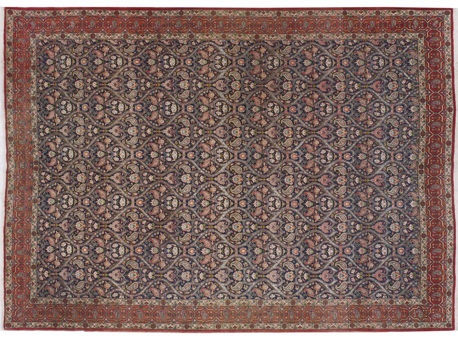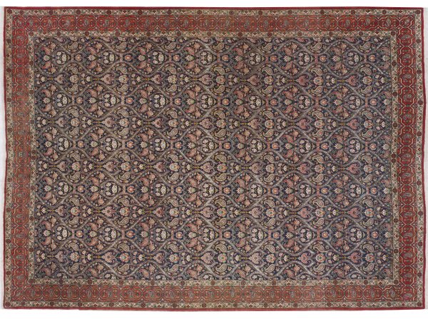 Ghom-Teppich Persien. Wolle mit Seide auf Baumwolle. Auf dunklem Fond flächendeckende Musterung aus gitterartig angelegten Arabesken und Bothé-Blüten im Rapport. Umlaufend breite rotgrundige Bordüre flankiert von schmalen Nebenbordüren. Altersspuren. 247 cm x 338 cm.