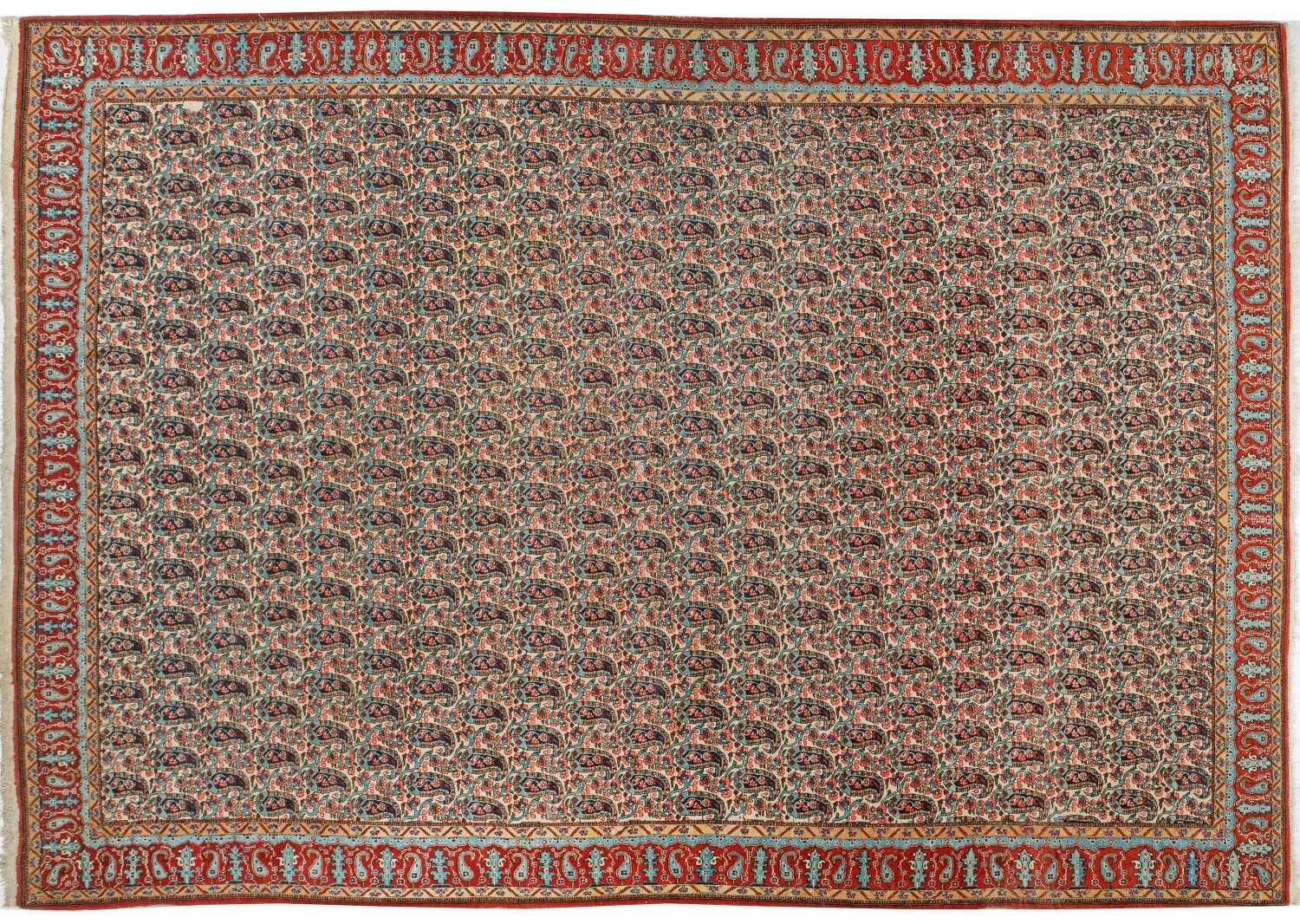 Ghom-Teppich Persien. Mitte 20. Jh.; Wolle auf Baumwolle. Im Innenfeld flächendeckend dichte Musterung aus Bothéblüten im Rapport. Umlaufend schmale, rotgrundige Bordüre, flankiert von schmalen Nebenbordüren. 323 cm x 224 cm.