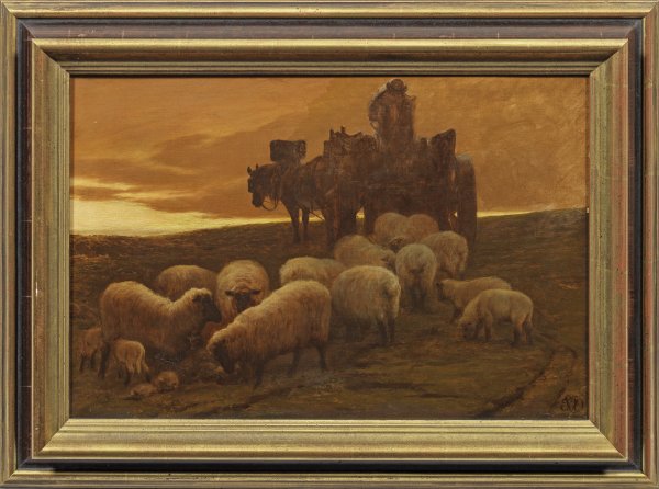 Stimmungsvolle, ländliche Szene des schottischen Malers, der zu den gefragtesten Künstlern in der viktorianischen Epoche zählte und 1869-1900 vielfach in der Royal Academy und Royal Scottish Academy ausstellte. Mit Vorliebe malte Douglas Jagdszenen, Hunde, ländliche Genremotive und Jersey-Rinder, die er selbst hielt. Zu seinen Sammlern zählten Sir Charles Tennant, Königin Victoria und ihr Sohn Eduard VII.; Öl/Lwd.; R. u. Ligatur-Monogr.; 35,5 cm x 53 cm. Rahmen.