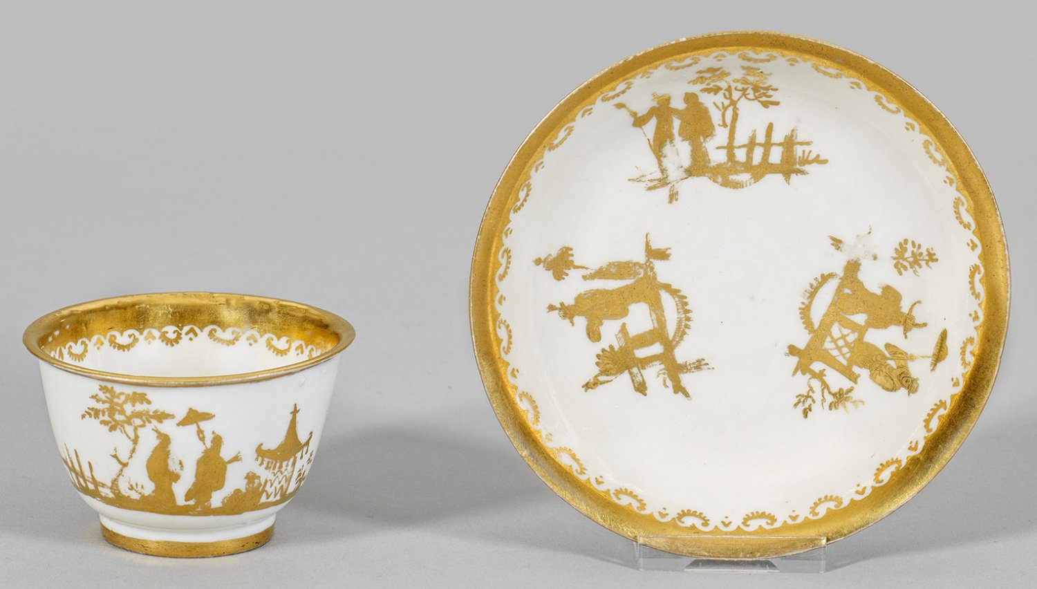 Koppchen mit Augsburger Goldchinesen auf Unterschale. Böttgerporzellan. Leicht gebauchter, sich konisch erweiternder Korpus mit ausschwingendem Rand. Beidseitig der Wandung in den Spiegeln sog. Chinoiserien, szenische Darstellungen von Chinesen zwischen blühenden Bäumen und Architektur. Umlaufend breite Bordüre mit Augsburger Randornament aus C-Schnörkeln mit Punktrücken. Äußerst feine, radierte Goldmalerei wohl von Bartholomäus Seuter in Augsburg. Minim. ber.; H. 5 cm. D. 7,5 cm - 11,5 cm.
