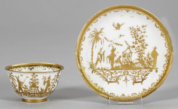 Koppchen mit Augsburger Goldchinesen auf Unterschale. Böttgerporzellan. Leicht gebauchter sich konisch erweiternder Korpus mit ausschwingendem Rand. Auf der Wandung und im Spiegel breite Ornamentkonsolen aus Laub- und Bandelwerk mit szenischen Darstellungen von Chinesen in blühenden Gartenlandschaften. Umlaufende Randbordüre aus Ornamentschnörkeln. Feine radierte Goldmalerei der Augsburger Seuter-Werkstatt. Unterseiten mit Resten von rot-lüstrierter Eisengallustinte. H. 4 5 cm.