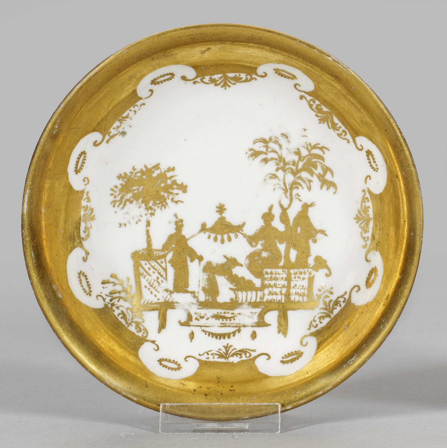 Unterschale mit Augsburger Goldchinesen Böttgerporzellan. Auf der Außenwandung umlaufender Kannelurenfries im Relief, alternierend rankenornamentiert und vergoldet. Im vertieften Spiegel breite Ornamentkonsole mit szenischer Darstellung von Chinesen in baumbestandener Gartenlandschaft. Breite Randbordüre mit Rankenwerk und Punktornamenten. Feine radierte Goldmalerei aus der Augsburger Seuter-Werkstatt. Minim. best.; D. 13,5 cm.