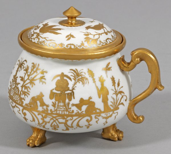 Kleiner Cremetopf mit Augsburger Goldchinesen Böttgerporzellan. Gebauchte Form auf drei Tatzenfüßen. Beidseitig der Wandung zwei von Konsolen getragene, szenische Darstellungen festlich gekleideter Chinesen im Gebet bzw. mit Schreibtafeln. Umgeben von blühenden, asiatischen Gartenlandschaften. Gehöhter Deckel mit der Darstellung von drei Vögeln. Feine, radierte Goldmalerei der Seuter-Werkstatt. Reste von Eisengallustinte. Unw. rest.; H. 11 cm.