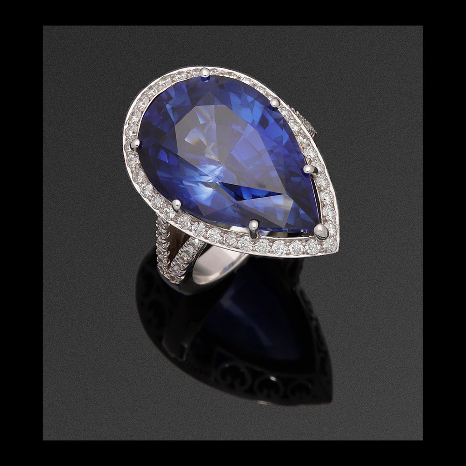 Weißgold, gest. 14 ct.; Zentral besetzt mit einem royalblauen Saphir von ca. 27 ct. im Pearcut, entouriert von Brillanten von zus. ca. 1,10 ct. (D-F/vvs-vs). Gew. ca. 14,11 g.