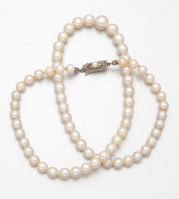 Necklace set with 68 white akoya culture pearls approx. 5,9 mm - 9,9 mm, clasp in 14 k gold.