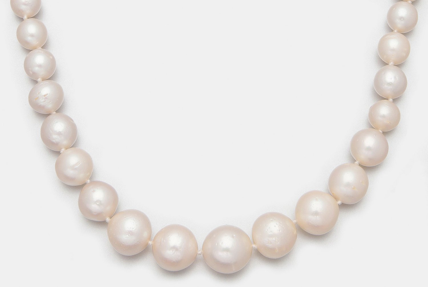 Sterlingsilber, mit Gelbgold verbödet, gest. 925. Einreihige Kette aus insg. 39 schneeweißen, teilw. nahezu makellosen Südsee-Zuchtperlen von ca. 8,9 mm - 14 mm, in sehr farbintensivem rosé-grünem Lüster. Magnetkugelschließe. Gew. ca. 78,64 g.
