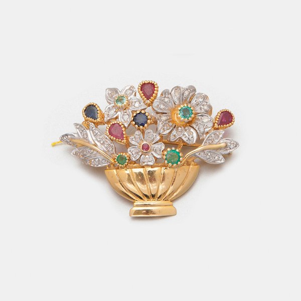 Gelbgold, gest. 585. Dekorativ gestaltet in Form eines Blütenbuketts in Schale, ausgefasst mit Saphiren, Rubinen und Smaragden von zus. ca. 1,00 ct. und Diamanten von zus. ca. 0,45 ct.; Gew. ca. 15,59 g.