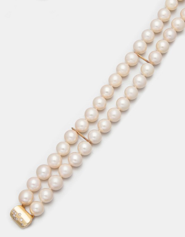 Gelbgold, gest. 585. Zweireihiges Armband aus weißen Zuchtperlen von ca. 9 mm in sehr farbintensivem rosé-grün changierendem Lüster. Schließe besetzt mit Brillanten von zus. ca. 0,20 ct.