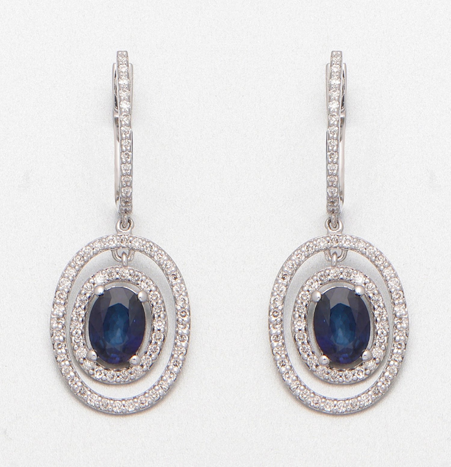 A pair of earrings set two with royal blue sapphires approx. 0,80 ct. and diamonds approx. 1,20 ct., in 14 k white gold.
