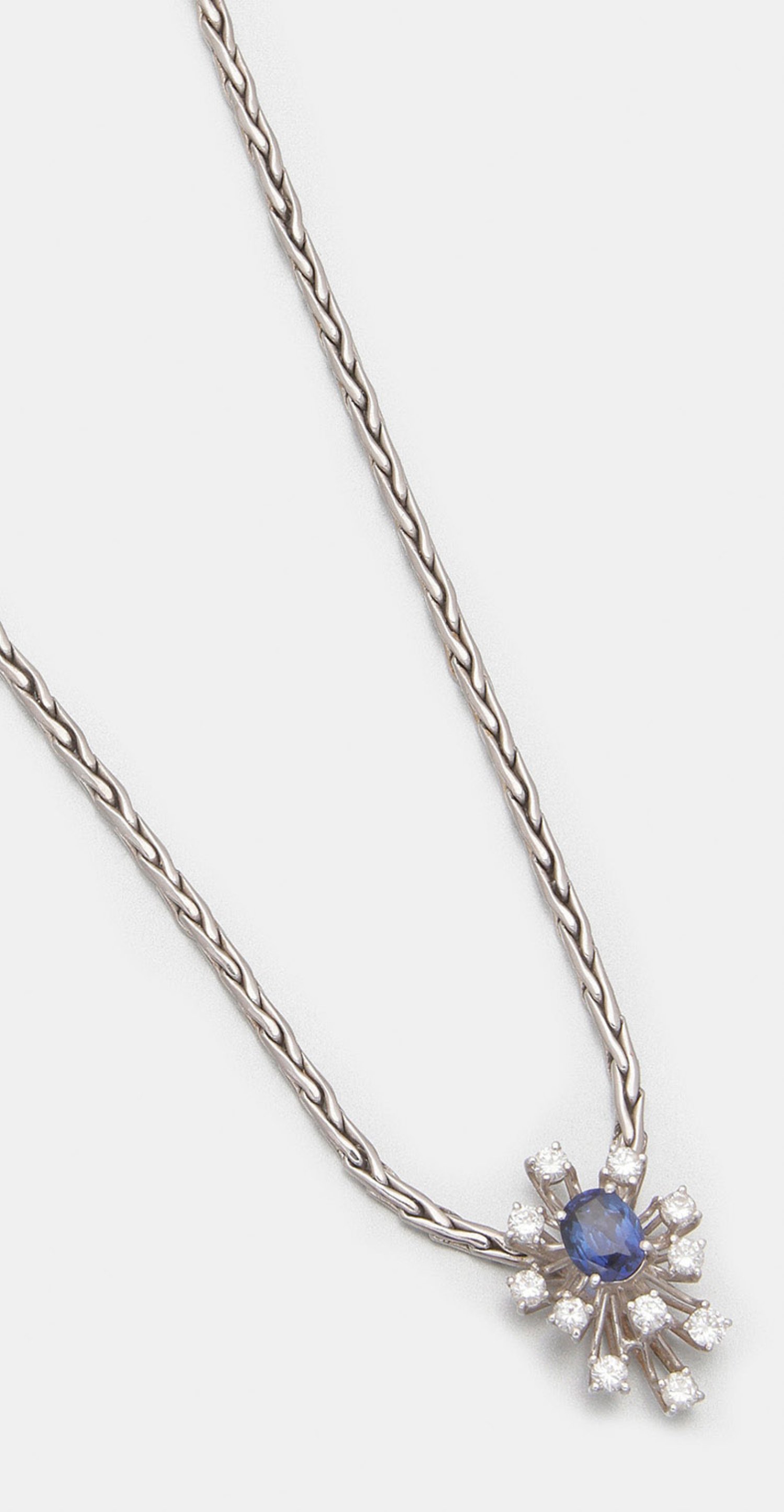 Necklace set with a royal blue sapphire approx. 1,60 ct. and brilliants approx. 0,60 ct., in 18 k white gold.