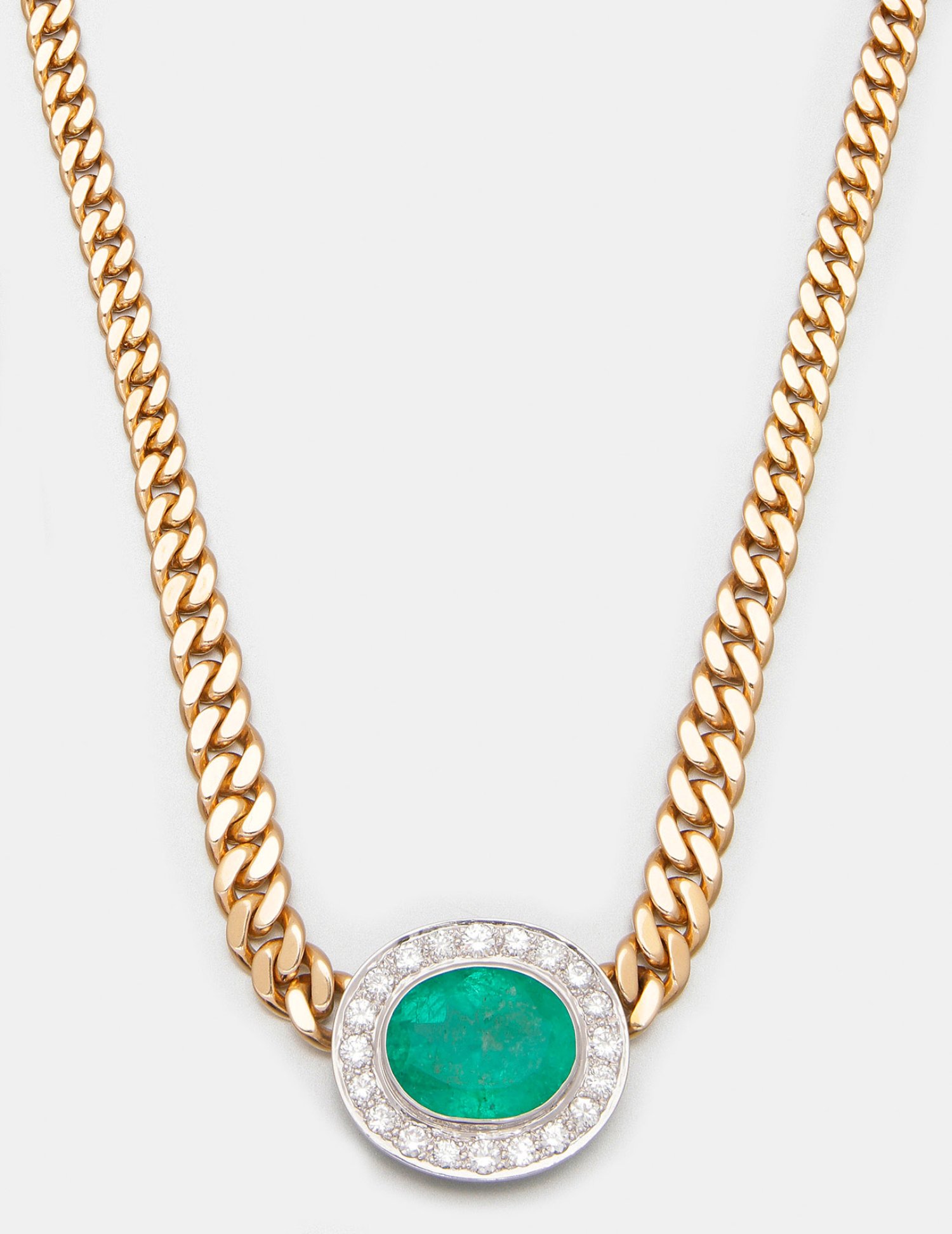 Gelbgold, gest. 750. Massives, leicht verlaufendes Panzerband, zentraler medaillonförmiger Anhänger besetzt mit einem leuchtendgrünen Smaragd von ca. 11,00 ct., entouriert von Brillanten von zus. ca. 4,20 ct.; Gew. ca. 76,35 g.