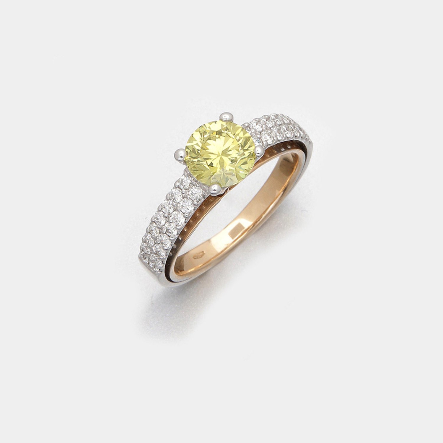 Weißgold, gest. 750. Zentral besetzt mit einem Fancy Vivid-Yellow-Brillanten von ca. 1,55 ct. (vs2), flankiert von Brillanten von zus. ca. 0,65 ct. (F-G/if-vvs). Gew. ca. 5,36 g.