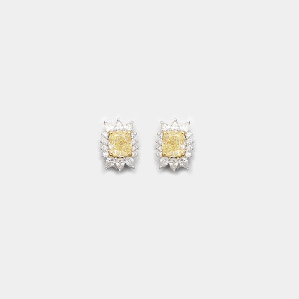Pair of earrings set with two natural fancy yellow diamonds each approx. 1,00 ct. and white diamonds approx. 1,73 ct., in 18 k white gold. Certificates included.