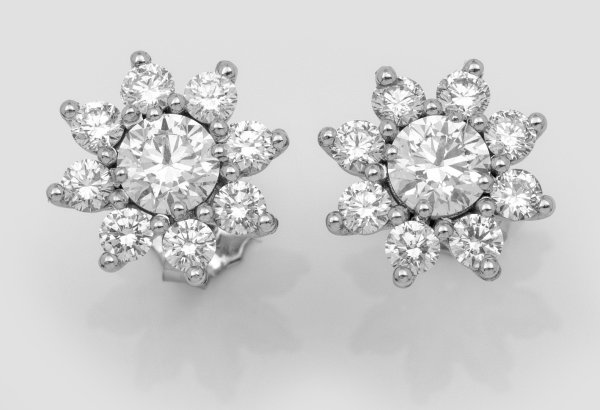 Weißgold, gest. 750. In blütenförmiger Anordnung besetzt mit 2 Brillanten von zus. ca. 1,00 ct. (H/si1), entouriert von 16 Brillanten von zus. ca. 1,17 ct. (F-G/vs). Ges.-Gew. ca. 3,83 g.