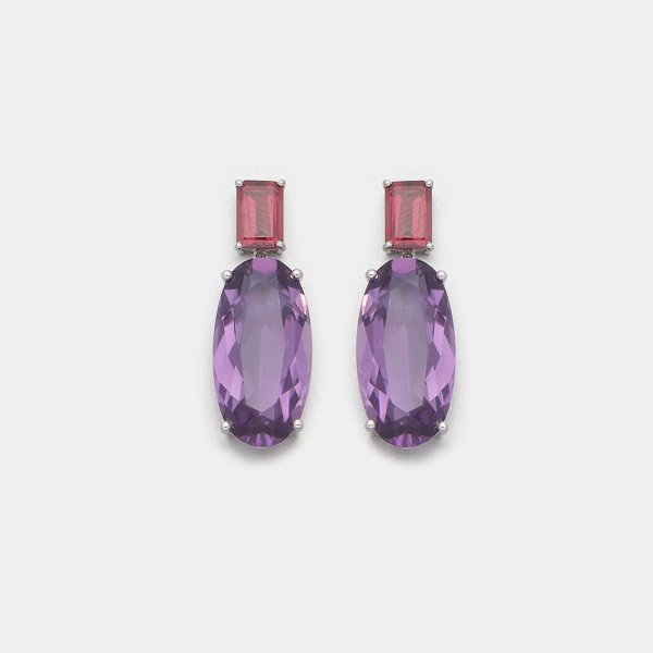 Pair of earrings set with two amethysts and two pink coloured rhodolites approx. 2,64 ct., in 18 k white gold.