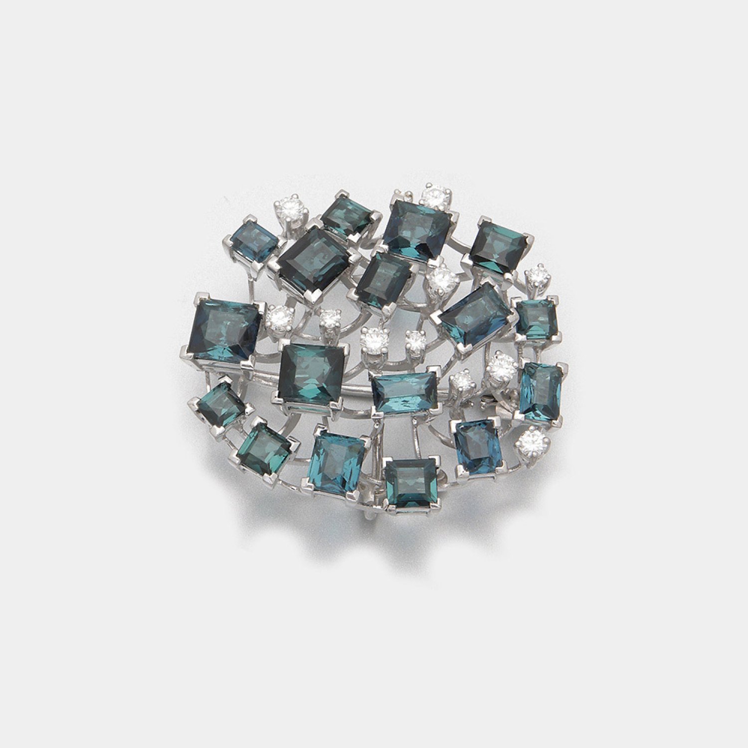 Weißgold, gest. 750. Schauseitig besetzt mit 17 unbehandelten petrolgrünen Turmalinen von zus. ca. 9,00 ct. im Carrée- und Scherenschliff, akzentuiert durch Brillanten von zus. ca. 0,60 ct. (G-H/if-vvsi). Gew. ca. 14,86 g.