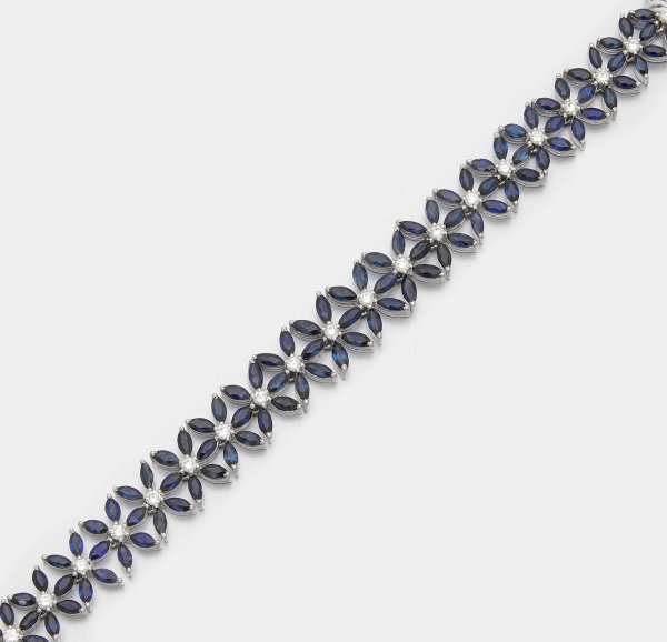 Weißgold, gest. 585. Schauseitig besetzt mit royalblauen Saphiren von zus. ca. 15,55 ct. im Navetteschliff in blütenförmiger Anordnung, akzentuiert durch Brillanten von zus. ca. 1,32 ct.; Gew. ca. 22,95 g.
