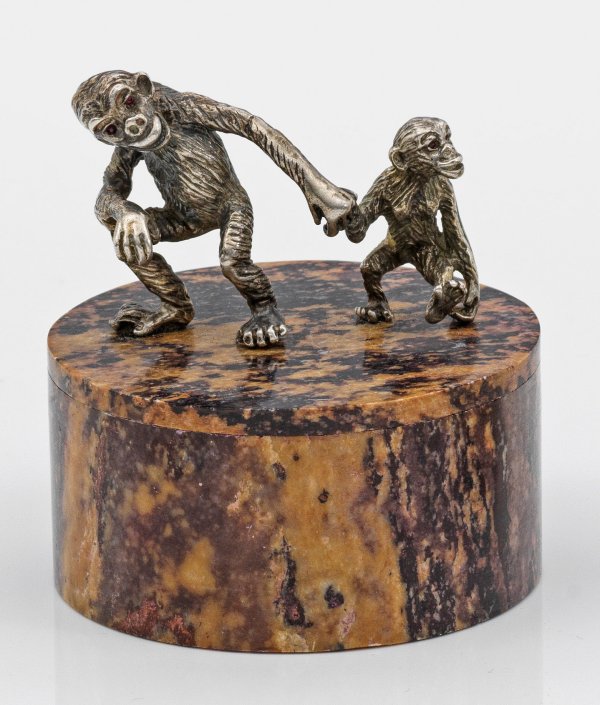 Runder, zylindrischer Korpus aus braun und beige gemasertem, geschliffenem Stein. Auf flachem Deckel zwei vollplastisch gestaltete und applizierte Affen, sich an den Händen haltend. Als Augen rote Farbsteine. Gest. 84. H. 8 cm. D. 7,5 cm.