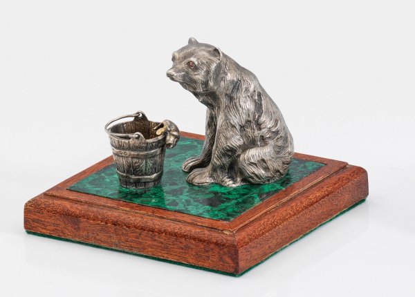 Silber und Malachit. Naturalistische Wiedergabe eines Bären mit Farbsteincabochons als Augen. Vor ihm ein Bottich mit einem Fisch. Dekorativer Sockel aus Malachit, umgeben von getrepptem Holzrahmen. Gest. 84. H. 7,5 cm. 10,2 cm x 10,2 cm.