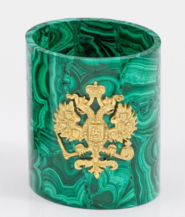 Malachit und Silber, vergoldet. Runder, zylindrischer Korpus. Auf der Wandung der reliefplastisch applizierte und gekrönte russische Doppeladler. Gest. 84. H. 8,5 cm. D. 7,5 cm.