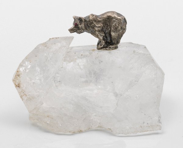 Silber und Bergkristall. Auf einem geschliffenen Eisberg aus Bergkristall eine kleine Skulptur in Form eines vollplastischen, naturalistisch gestalteten Bären mit Farbsteinen als Augen. Gest. 84. H. 4,5 cm. 7,5 cm x 7 cm.