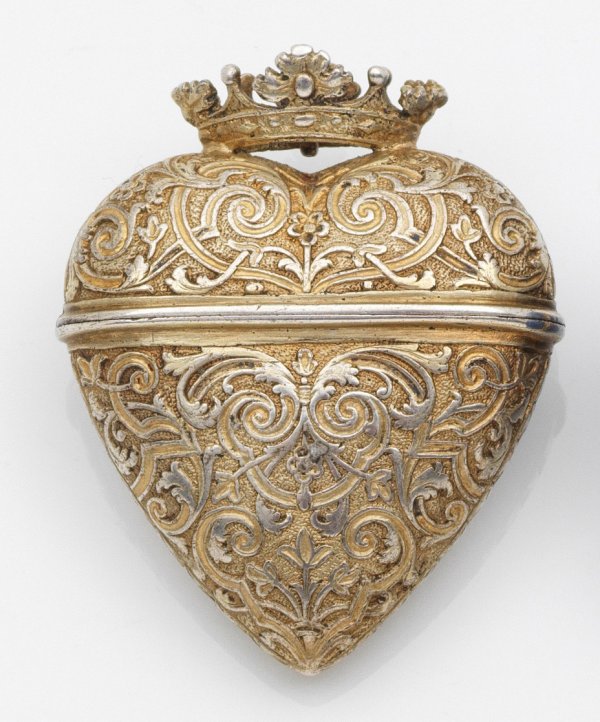Silber, vergoldet. Herzförmiger, fein floral reliefierter Korpus mit scharniertem Deckel und großer plastisch und durchbrochen gearbeiteter Krone. Beidseitiger, gravierter Volutendekor. Innen vergoldet. Gew. ca. 20 g. H. 4,3 cm. 3,4 cm x 1,3 cm.