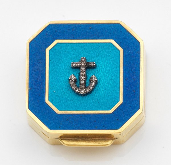 im Stil von Karl Fabergé. Silber, vergoldet und emailliert. Quadratischer Korpus mit gekanteten Ecken. Scharnierter Deckel, zentral besetzt mit kleinem, appliziertem Anker, ausgefasst mit Diamantrosen über hellblau emailliertem und guillochiertem Grund. Umlaufend ein royalblau emaillierter Rahmen mit goldener Profillinie. Gest. 88. Gew. ca. 40 g. H. 1,2 cm. 3 cm x 3 cm.