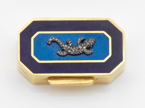 im Stil von Karl Fabergé. Silber, vergoldet und emailliert. Rechteckiger Korpus mit gekanteten Ecken. Scharnierter Deckel, zentral besetzt mit kleinem, appliziertem Salamander, ausgefasst mit Diamantrosen über royalblau emailliertem und guillochiertem Grund. Umlaufend ein marineblau emaillierter Rahmen mit goldener Profillinie. Gest. 88. Gew. ca. 35 g. H. 1,2 cm. 3,8 cm x 2,2 cm.