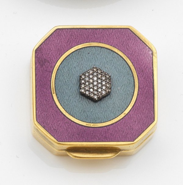 im Stil von Karl Fabergé. Silber, vergoldet und emailliert. Quadratischer Korpus mit gekanteten Ecken. Scharnierter Deckel, zentral besetzt mit kleinem, appliziertem Hexagon, ausgefasst mit Diamantrosen über grau emailliertem und guillochiertem Grund. Umlaufend ein himbeerfarben emaillierter Rahmen mit goldener Profillinie. Gest. 88. Gew. ca. 30 g. H. 1,2 cm. 3 cm x 3 cm.