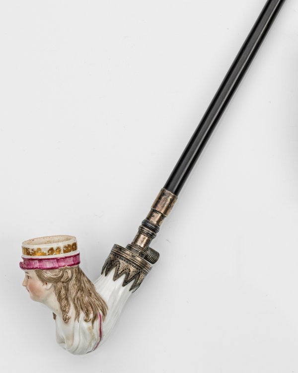 An Austrian Rococo porcelain pipe bowl in the shape of a female bust with a cap. Lid is missing. Gold partly rubbed.