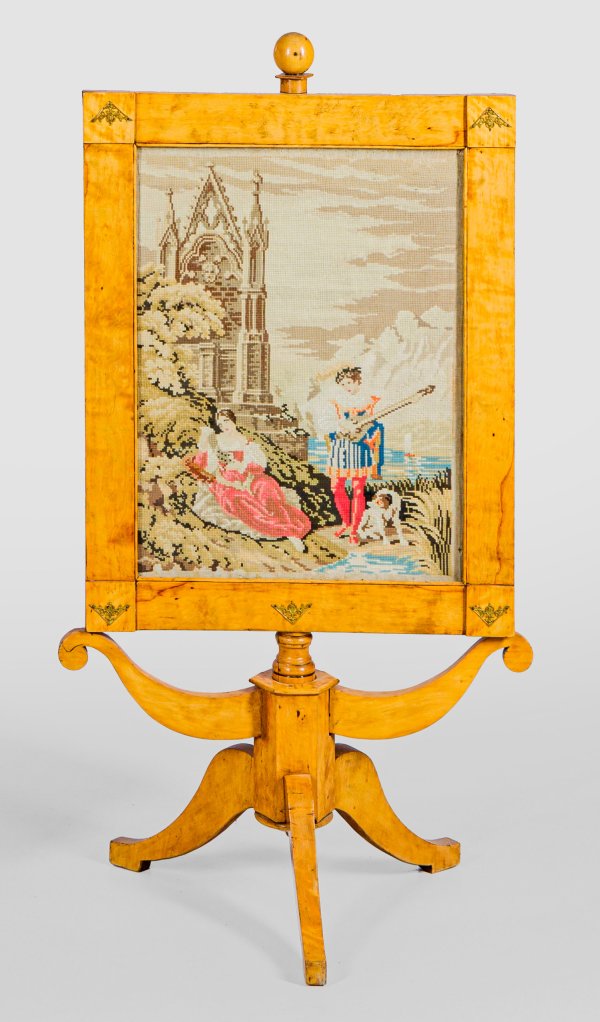 Birkenholz. Gekanteter Schaft auf geschweiften Beinen. Davon ausgehend geschwungene Streben als Träger für rechteckige Rahmung mit verkröpften Ecken. Flächendeckende Petit Point Stickerei mit figuraler Szenerie. H. 103 cm.
