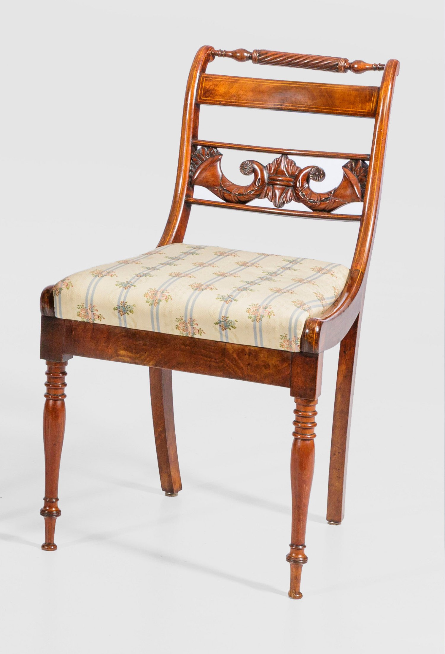 Mahagoni, massiv und furniert. Trapezförmige Zarge auf gegliederten Balusterbeinen. Weit zurückschwingende Rückenlehne mit durchbrochen gearbeitetem Mittelsteg aus reliefplastischen Füllhörnern sowie Balusterstab als oberen Abschluss. Sitzfläche gepolstert und bezogen. Sitz-H. 47 cm.