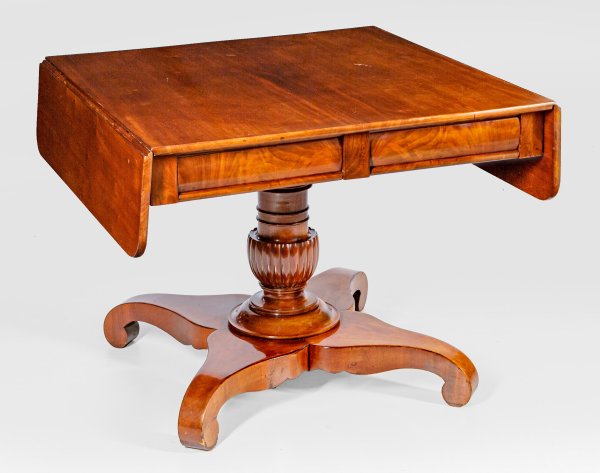 Mahagoni, furniert. Über geschweifter Sockelplatte, in Volutenfüße übergehend, mehrfach gegliederter und teilw. godronierter Balusterschaft als Träger für zweischübigen Zargenkasten und rechteckige, seitlich aufstellbare Dekplatte. H. 67,5 cm. 85/124 cm x 86,5 cm.
