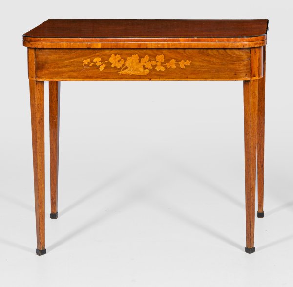Mahagoni, furniert sowie Einlagen aus Ahorn. Gerade, schauseitig an den Ecken gerundete Zarge auf hohen, konischen Vierkantbeinen. In der Front intersiertes Hundepaar mit Eichenlaub. Gering überstehende, aufklappbare Deckplatte. H. 76 cm. 83,5 cm x 44/88 cm.