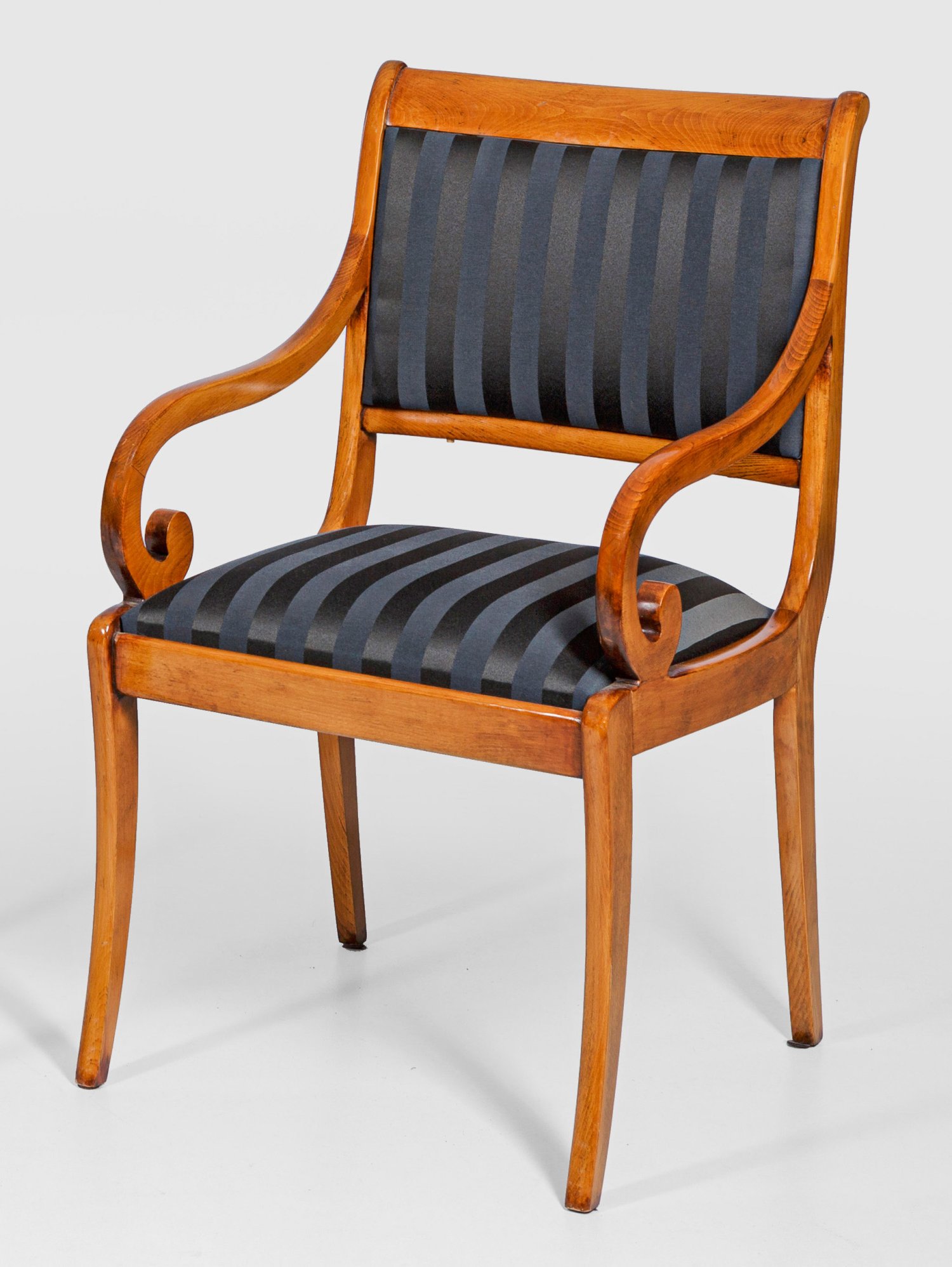 Buchenholz, kirschbaumfarben gebeizt. Trapezförmige Zarge auf leicht ausgestellten konischen Vierkantbeinen. Geschweifte Armlehnen aus stilisierten Voluten sowie rechteckige, leicht gewölbte Rückenlehnenrahmung. Gepolstert und bezogen. Sitz-H. 49 cm.