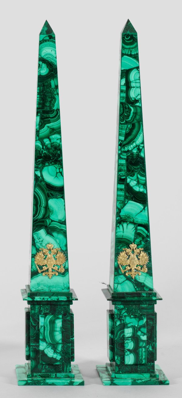 A pair of Russian malachite obelisks, set with the gilt silver imperial eagle. Standard mark 84.