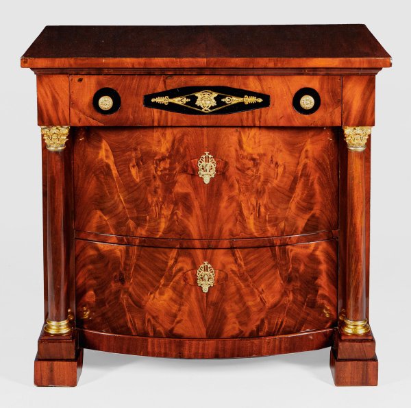 Mahagoni, furniert sowie teilw. schwarz lackiert. Gerader, rechteckiger Korpus auf gekantetem Zargensockel. In der gegliederten Front zwei bombierte Schubladen, flankiert von eingestellten Vollsäulen als Stütze für vorkragendes Schubfach. Rechteckige Deckplatte. Rest.; H.84,5 cm. 91 cm x 52,5 cm.