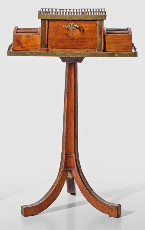 Mahagoni, furniert sowie Applikationen aus Messing. Ausgestellte, gekantete Beine, in konischen Schaft übergehend. Oberhalb rechteckige, galeriegerahmte Deckplatte mit entsprechendem, einschübigem Aufsatz, flankiert von Fächern mit gewölbtem Zylinderverschluss. H. 90 cm. 57 cm x 29 cm.