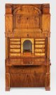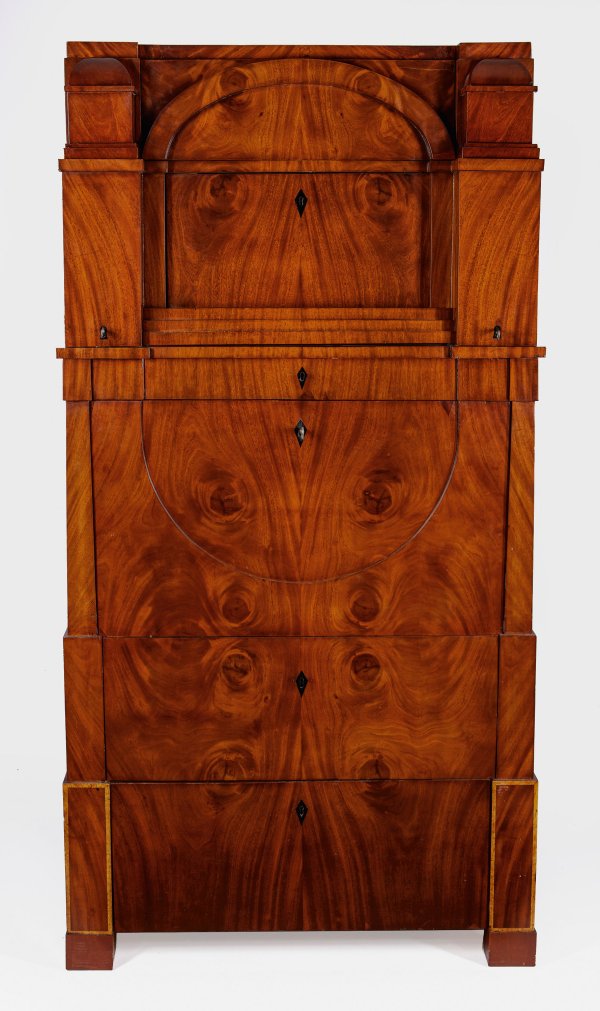 Mahagoni und Birkenmaser, furniert. Hochrechteckiger, sich gestaffelt verjüngender Korpus auf gekanteten Füßen. In der gegliederten Front drei Schubladen unterschiedlicher Größe sowie abklappbare Arbeitsfläche. Dahinter gestaffelt angeordnete Facheinteilung aus zentraler, verspiegelter Segmentnische sowie bombierten Schubladen. Architektonisch gegliederter Aufsatz, flankiert von je eintürigen Pfostenelementen. In der Mitte breite Tür sowie zwei Schubfächer. Rest. mit Erg.; H. 201 cm. 195 cm x 45 cm.