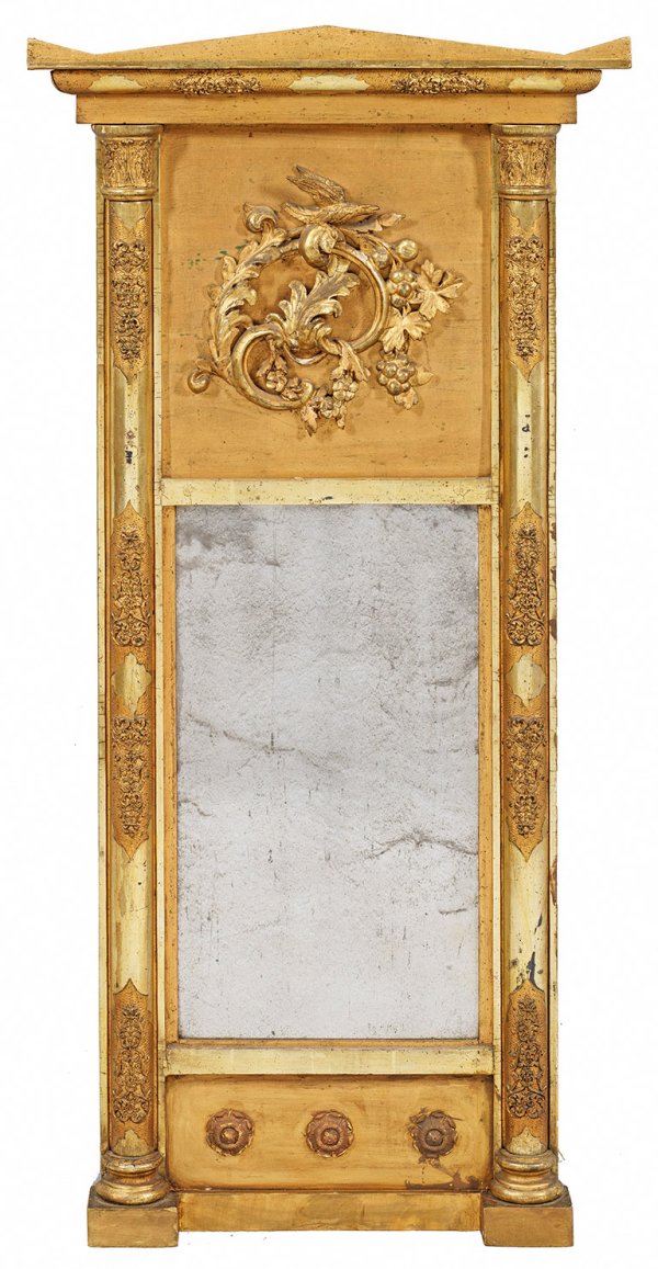 Holz, geschnitzt bzw. teilw. stuckiert, gefasst und vergoldet. Hochrechteckige Spiegelrahmung, flankiert von eingestellten Halbsäulen mit üppigem, reliefiertem Blattwerk. Breites Giebelfeld mit reliefplastischer Blattvolute, Reben und Vogel sowie oberhalb flacher Dachabschluss. Altes Spiegelglas. 139 cm x 56 cm.