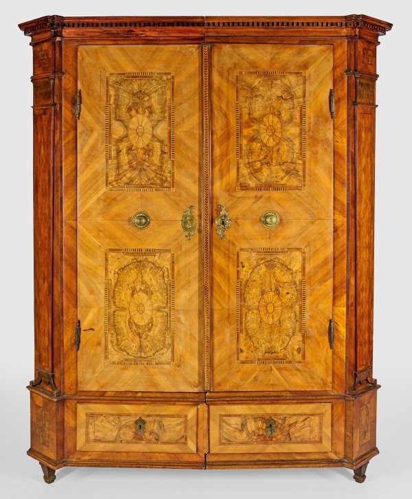 Nussbaum und Nussbaummaser, furniert. Gerader, hochrechteckiger Korpus, flankiert von breiten, schräggestellten Ecklisenen mit flachen Pilastern auf zweischübigem Profilsockel und gekanteten Balusterfüßen. In der gegliederten Front zwei große Türen mit eingelegten Rosetten. Korrespondierendes Profilgesims mit Zahnfries. Flächendeckend breit gerahmte Furnierfelder, von Bandeinlagen begrenzt. H. 210 cm. 173 cm x 70 cm.