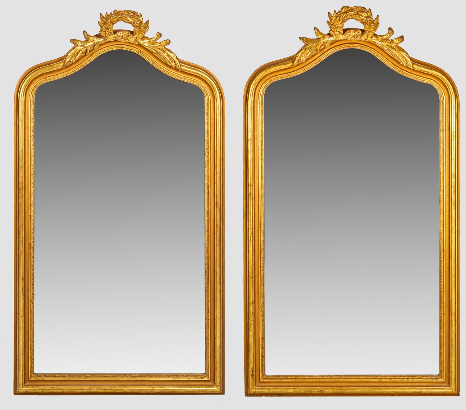 Holz, vergoldet. Gerade, hochrechteckige, umlaufend profilierte Spiegelrahmung mit hoch gewölbtem oberen Abschluss sowie durchbrochen gearbeiteter Bekrönung aus Lorbeerkränzen. Facettiertes Spiegelglas. 179 cm x 101 cm.