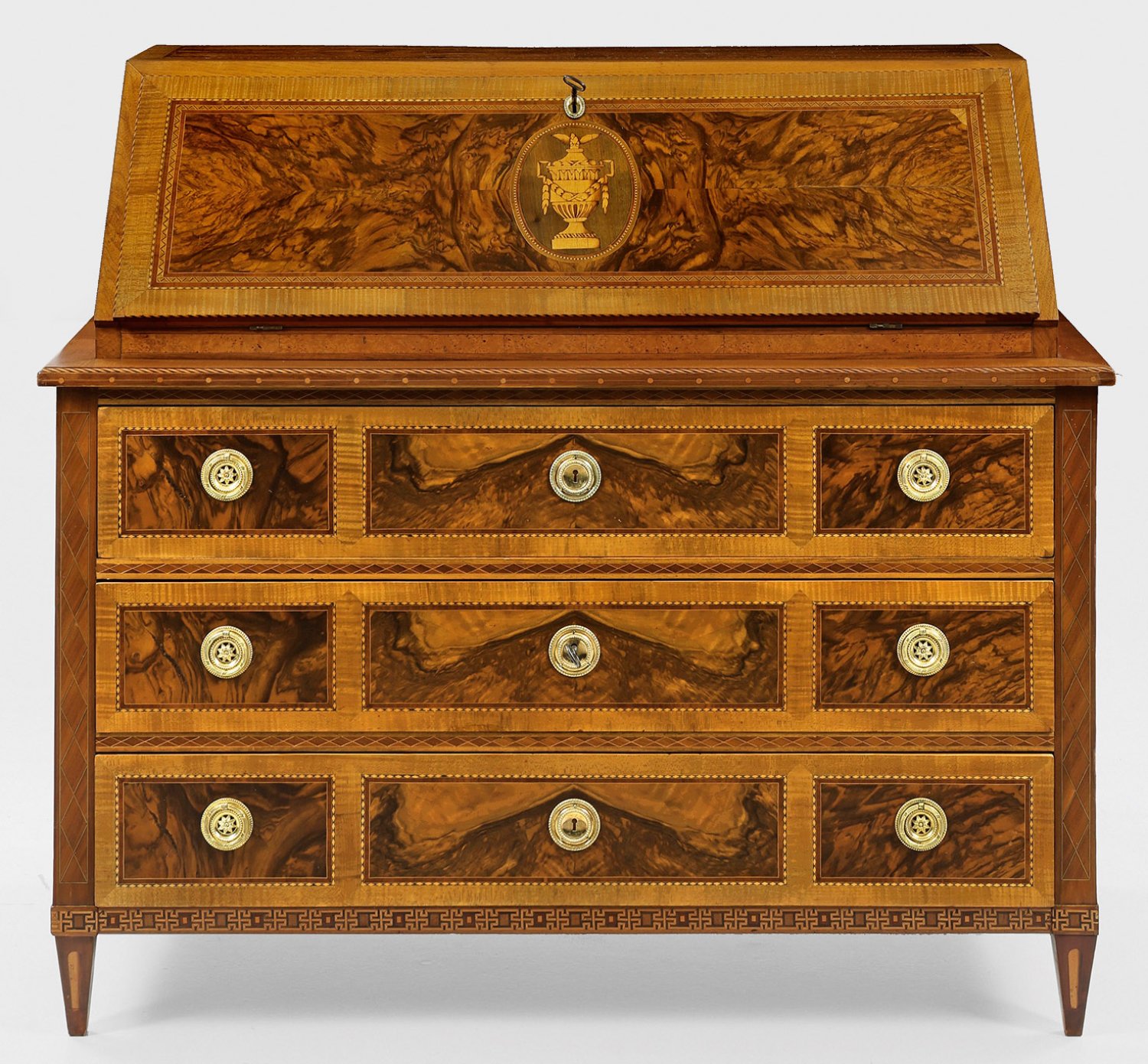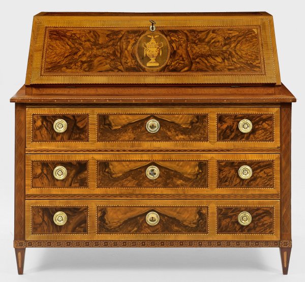 Nussbaum, Nussbaummaser und Riegelahorn, furniert sowie fein gearbeitete Einlagen aus unterschiedlichen, teilw. gefärbten Edelhölzern, wie Ahorn und Pflaume. Gerader, querrechteckig angelegter Korpus, seitlich mit leicht erhabenen Füllungen auf konischen Vierkantbeinen. In der gegliederten Front drei breite Schubladen. Zurückgesetzter Aufsatz mit schräggestellter, abklappbarer Arbeitsfläche. In der Mitte eingelegtes Medaillon mit großem Vasenmotiv. Dahinter gestaffelte Facheinteilung. Flächendeckend breit gerahmte Furnierfelder, von unterschiedlichen Ornamentbändern begrenzt. H. 111 cm. 124 cm x 59 cm.