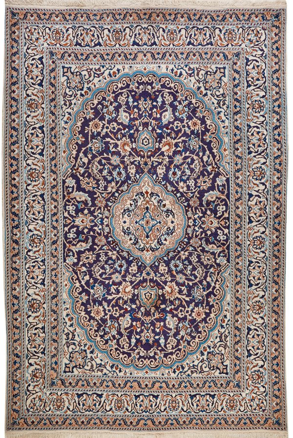 Persien. Wolle auf Baumwolle. Im ovalen, dunkelblauen Innenfeld Zentralmedaillon mit Anhängern sowie flächendeckende Musterung aus Rankenwerk. Umlaufend breite, elfenbeinfarbene Bordüre aus Palmetten, flankiert von schmalen Nebenbordüren. 250 cm x 160 cm.