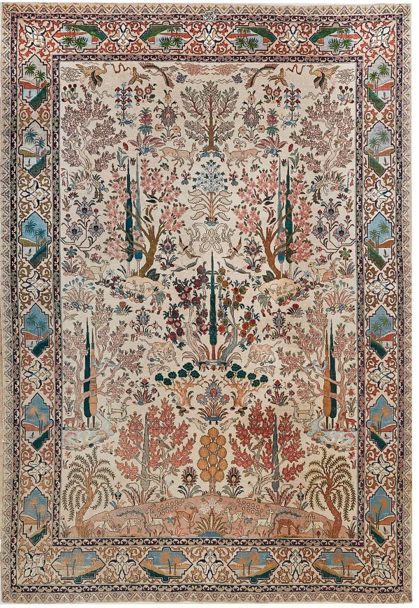 Persien. Um 1940. Wolle auf Baumwolle. Im elfenbeinfarbenen Innenfeld flächendeckende Paradiesgartenmusterung aus üppigen Blütenzweigen und Bäumen sowie detailreiche Darstellung unterschiedlicher Wildtiere wie Rotwild und Kaninchen sowie Fischen und Vögeln. Umlaufend breite Bordüre aus Kartuschenmotiven mit stilisierten Landschaften sowie eingerollten Voluten. Sign.; 420 cm x 275 cm.