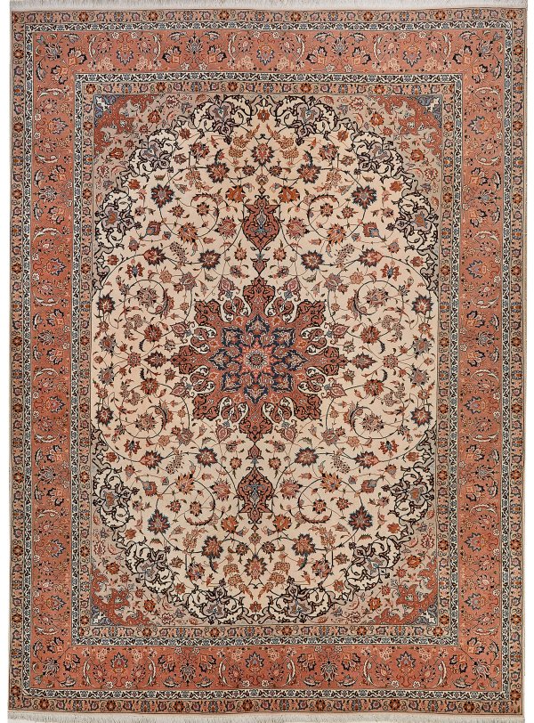 Persien. Korkwolle mit Seide auf Baumwolle. Im cremefarbenen Innenfeld großes, kupferfarbenes Zentralmedaillon mit Anhängern sowie korrespondierende Ecklösungen. Flächendeckend dichte Musterung aus Palmettenranken. Umlaufend breite Bordüre in entsprechender Farbigkeit. 251 cm x 349 cm.